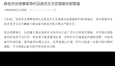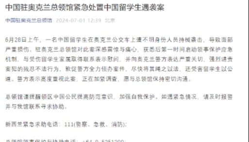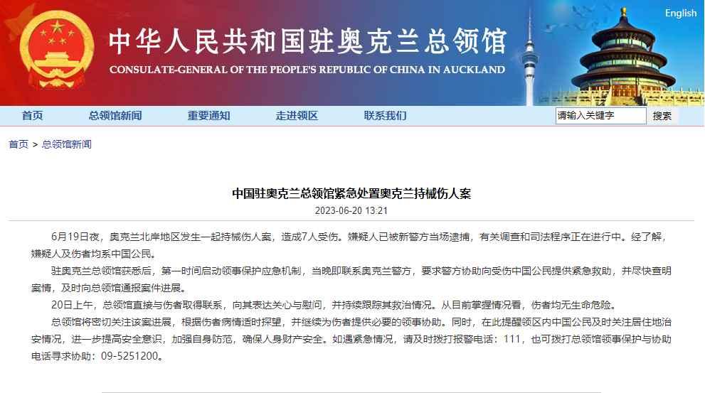中國駐奧克蘭總領館獲悉後,第一時間啟動領事保護應急機制,當晚即聯繫奧克蘭警方,要求警方協助向受傷中國公民提供緊急救助,並盡快查明案情,及時向總領館通報案件進展。 20日上午,總領館直接與傷者取得聯繫,向其表達關心與慰問,並持續跟蹤其救治情況。從目前掌握情況看,傷者均無生命危險。 總領館將密切關注該案進展,根據傷者病情適時探望,並繼續為傷者提供必要的領事協助。同時,在此提醒領區內中國公民及時關注居住地治安情況,進一步提高安全意識,加強自身防範,確保人身財產安全。如遇緊急情況,請及時撥打報警電話:111,也可撥打總領館領事保護與協助電話尋求協助:09-5251200。 【編輯:丘志彬】