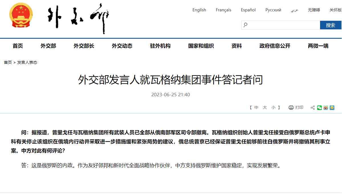 香港新聞網6月26日電 據中國外交部網站6月25日消息,外交部發言人就瓦格納集團事件答記者問。