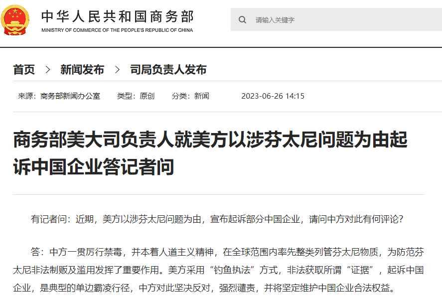 美方以涉芬太尼問題為由起訴中國企業,中國商務部回應分享到: