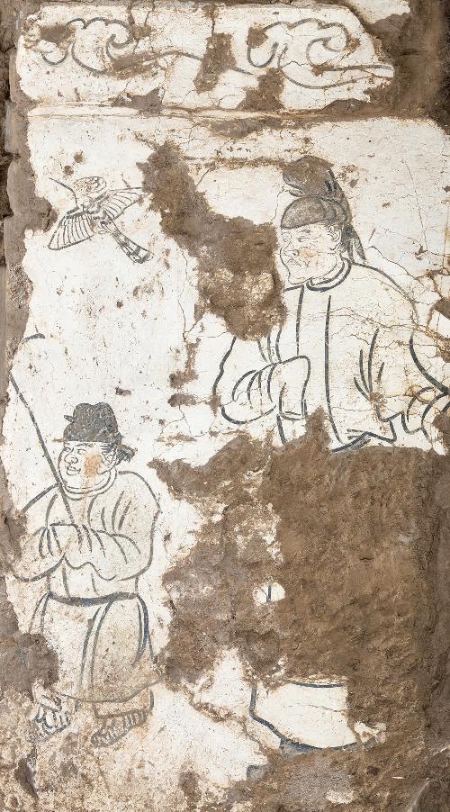 唐代康比比墓甬道口西壁人物圖。(受訪者供圖) 出土隨葬品43件(組),主要以彩繪陶俑為主,其中天王俑腳踏5只小鬼,造型複雜,胡人俑肌肉緊繃,齒舌畢現,堪稱精品。此外,值得注意的是,關中地區開元前期壁畫墓發現極少,學界對於這一時期壁畫布局不甚了解,該墓部分壁畫內容同期少見,分布位置特殊,體現出唐玄宗規範喪葬制度之前壁畫存在的多樣性,為唐神龍至開元晚期唐墓壁畫的演變提供了實證資料。