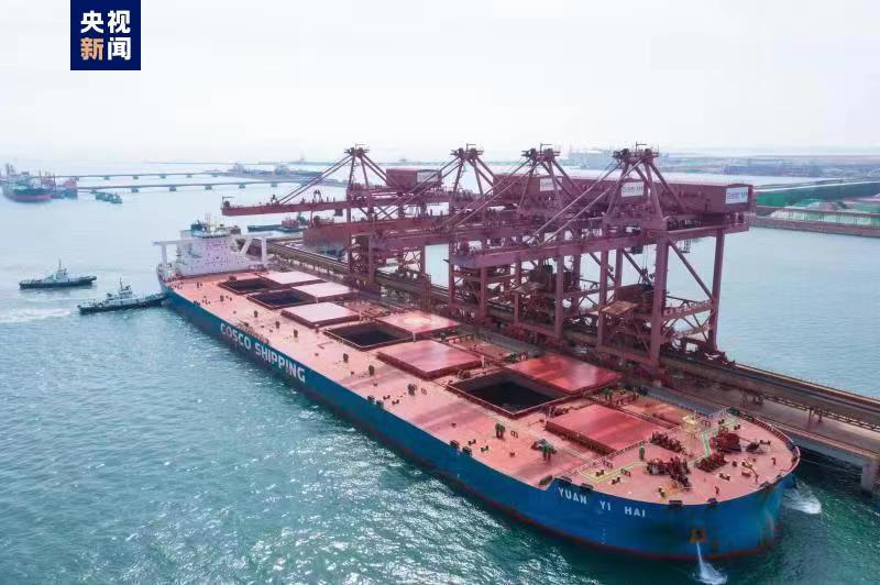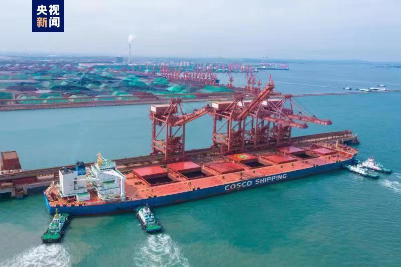 據央視新聞客戶端報道,此次接卸的“遠誼海”輪,船長361.9米,寬65米,載重量37.5506萬噸,是董家口港區40萬噸礦石專用碼頭接卸的第329條40萬噸級大船。因該船部分貨物需在7月3日前進行國際中轉,受天氣等因素影響,卸船時間十分緊迫。在船舶靠岸後,碼頭的4台額定卸率每小時3500噸的卸船機發揮最大潛能,同時應用皮帶“流程順啟”和“永磁同步變頻機”等新技術,保障了該船順利進行中轉作業。