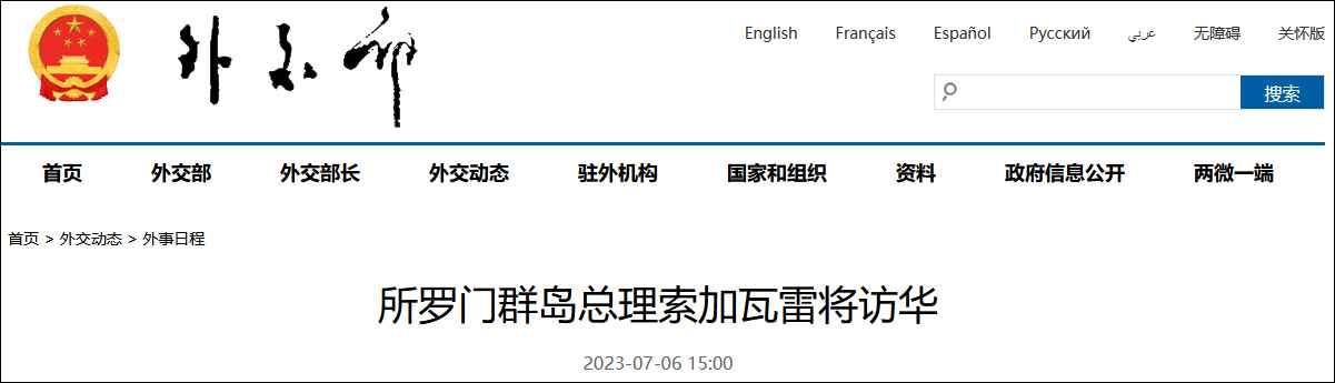 香港新聞網7月6日電 據中國外交部網站7月6日消息,外交部發言人汪文斌宣布:應國務院總理李強邀請,所羅門群島總理梅納西·索加瓦雷將於7月9日至15日對中國進行正式訪問。