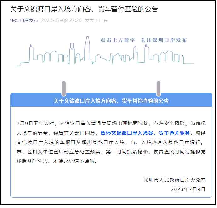 香港中通社7月10日電 深圳市人民政府口岸辦公室9日晚發佈公告,指文錦渡口岸出現地面沉降,香港入境深圳方向需要暫停客、貨車的查驗,出入境旅客從其他口岸通行。