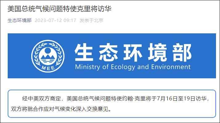 香港新聞網7月12日電 據微信公眾號“生態環境部”7月12日消息,經中美雙方商定,美國總統氣候問題特使約翰·克里將於7月16日至19日訪華,雙方將就合作應對氣候變化深入交換意見。