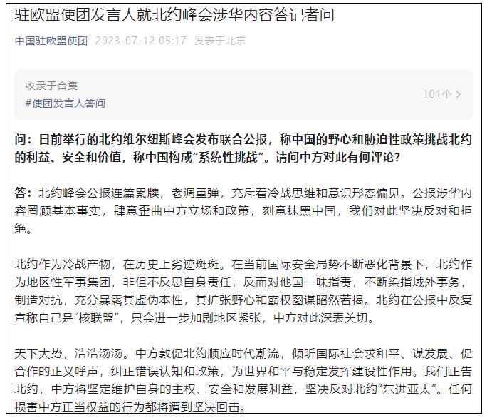 香港新聞網7月12日電 微信公眾號“中國駐歐盟使團”7月12日消息,駐歐盟使團發言人就北約峰會涉華內容答記者問。 問:日前舉行的北約維爾紐斯峰會發佈聯合公報,稱中國的野心和脅迫性政策挑戰北約的利益、安全和價值,稱中國構成“系統性挑戰”。請問中方對此有何評論? 答:北約峰會公報連篇累牘,老調重彈,充斥著冷戰思維和意識形態偏見。公報涉華內容罔顧基本事實,肆意歪曲中方立場和政策,刻意抹黑中國,我們對此堅決反對和拒絕。 北約作為冷戰產物,在歷史上劣跡斑斑。在當前國際安全局勢不斷惡化背景下,北約作為地區性軍事集團,非但不反思自身責任,反而對他國一味指責,不斷染指域外事務,製造對抗,充分暴露其虛偽本性,其擴張野心和霸權圖謀昭然若揭。北約在公報中反復宣稱自己是“核聯盟”,只會進一步加劇地區緊張,中方對此深表關切。 天下大勢,浩浩湯湯。中方敦促北約順應時代潮流,傾聽國際社會求和平、謀發展、促合作的正義呼聲,糾正錯誤認知和政策,為世界和平與穩定發揮建設性作用。我們正告北約,中方將堅定維護自身的主權、安全和發展利益,堅決反對北約“東進亞太”。任何損害中方正當權益的行為都將遭到堅決回擊。