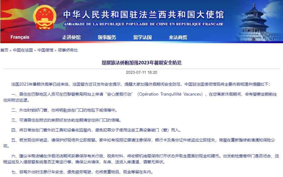 香港中通社7月12日電 鑒於法國警方發布安全提示,提醒大家今年暑期休假季期間的安全防範,中國駐法國使領館當地時間11日將主要內容梳理為“七點提醒”,對在法僑胞發出。