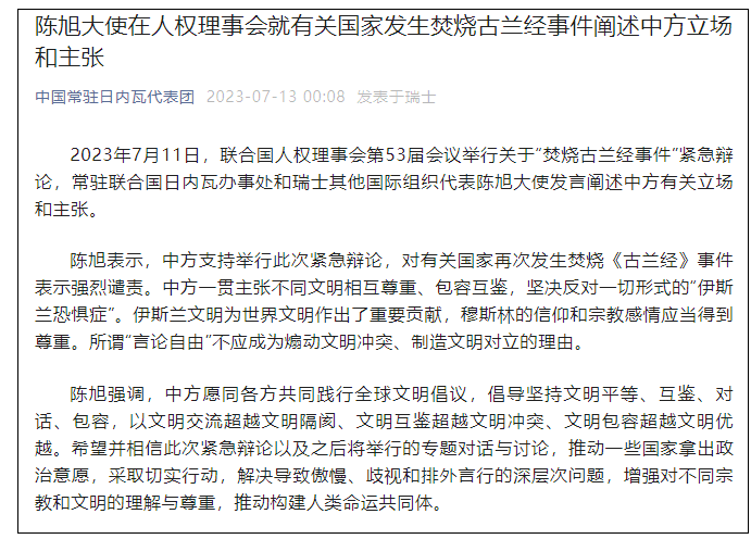 聯合國人權理事會就“焚燒古蘭經事件”緊急辯論,中方表態分享到: