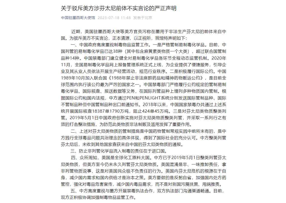美污稱在墨用於非法生產芬太尼的前體來自中國,中使館嚴正聲明分享到: