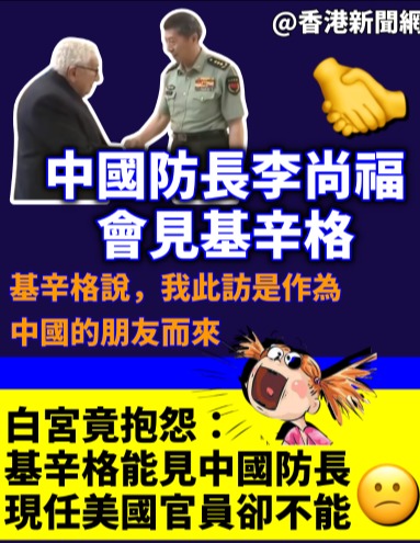 李尚福說,當今世界變亂交織,百年變局加速演進,人類社會面臨前所未有的挑戰。各國人民都希望中美兩國肩負大國責任,發揮引領作用,共同維護世界繁榮穩定。中國所走的和平發展道路是世界之福,不是世界之禍,美方應有正確的戰略判斷。新興國家與發達國家和平相處、融合發展,我們的世界未來才會更美好。 李尚福說,美方一些人未同中方相向而行,致使中美關係徘徊在建交以來的低谷,兩國相互依存的現實被漠視,合作共贏的歷史被曲解,友好溝通的氛圍被破壞。習近平主席提出相互尊重、和平共處、合作共贏三條原則,指明了新時期中美兩國的正確相處之道。我們始終致力於構建穩定、可預期、建設性的中美關係,希望美方與中方一道落實好兩國元首共識,共同推動兩國兩軍關係健康穩定發展。 基辛格說,我此訪是作為中國的朋友而來。當今世界挑戰與機遇並存,美中雙方應消除誤解、和平共存、避免對抗。歷史和實踐不斷證明,美中任何一方都承擔不起把對方作為對手的代價。如果兩國發生戰爭,不會給兩國人民帶來任何有意義的結果。認識和處理好美中關係,特別是扭轉當前困難局面,需要寬廣的思維和歷史哲學的思辨,需要雙方拿出智慧,通力合作、共同發展,兩軍應該加強溝通,盡全力為兩國關係發展創造積極成果,維護世界和平與穩定。 同日,李尚福還會見了來訪的孟加拉國空軍參謀長漢南。(完) 【編輯:丘志彬】
