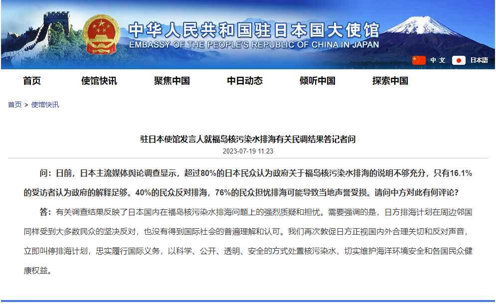 香港新聞網7月19日電 中國駐日本大使館發言人19日表示,日本傳媒就福島核污染水排海的民調結果反映,日本國內對排海問題的強烈質疑和擔憂。