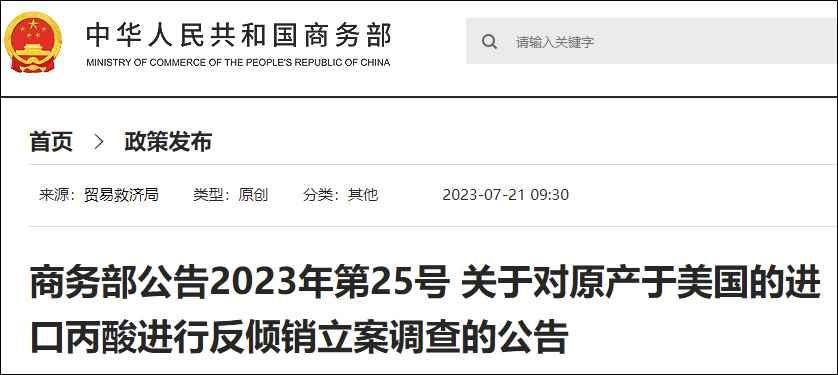 香港新聞網7月21日電 據中國商務部網站7月21日消息,商務部發佈關於對原產於美國的進口丙酸進行反傾銷立案調查的公告。