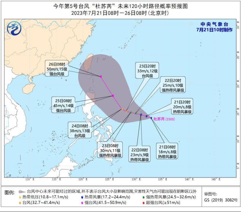 香港新聞網7月21日電 據中央氣象台網站21日消息,今年第5號颱風“杜蘇芮”(熱帶風暴級)(英文名稱:Doksuri;名字來源:韓國;名稱意義:一種猛禽,鷹)已於今天上午(北京時)在菲律賓以東洋面生成,上午8點鐘其中心位於菲律賓馬尼拉偏東方向約1280公里的西北太平洋洋面上,就是北緯13.9度、東經132.8度,中心附近最大風力有8級(18米/秒),中心最低氣壓為998百帕,七級風圈半徑240-280公里。 預計,“杜蘇芮”將以每小時10公里左右的速度向西偏北轉西北方向移動,強度逐漸加強,向台灣東部海面靠近,未來將影響中國東南沿海。