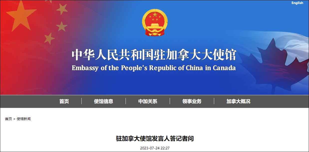 香港新聞網7月25日電 據中國駐加拿大大使館網站7月24日消息,駐加拿大使館發言人答記者問。