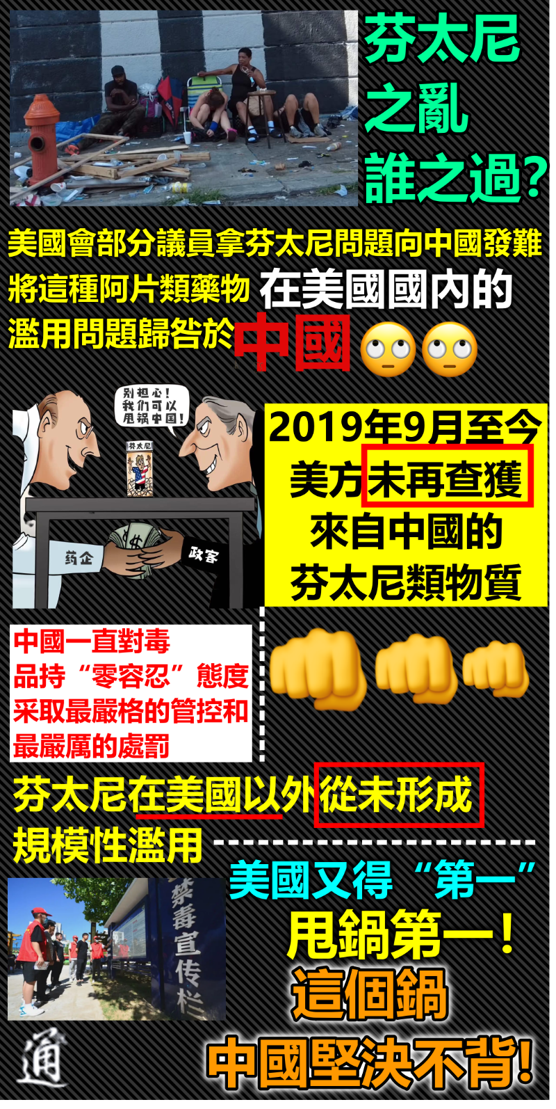 汪彥希製圖 美國國會參議院部分議員日前再次拿芬太尼問題向中國發難,將這種阿片類藥物在美國國內的濫用問題歸咎於中國,還聲稱將為此推動立法制裁中國。 然而事實上,2019年9月至今,美方未再查獲來自中國的芬太尼類物質;中國也一直對毒品持“零容忍”態度,採取最嚴格的管控和最嚴厲的處罰。值得注意的是,芬太尼在美國以外從未形成規模性濫用。 所以,美國芬太尼之亂是誰的鍋?不言自喻! 【編輯:汪彥希】
