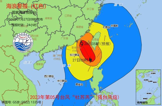 香港新聞網7月27日電 國家海洋預報台7月27日8時發佈海浪紅色警報:受今年第5號颱風“杜蘇芮”的影響:預計7月27日中午到28日中午,台灣海峽南部、南海東北部、巴士海峽將出現7到10米的狂浪到狂濤區,台灣海峽北部、台灣以東洋面將出現4到7米的巨浪到狂浪區,東海南部、釣魚島附近海域將出現3到5米的大浪到巨浪區,近海海域海浪預警級別為橙色;福建近岸海域將出現4.5到6米的巨浪到狂浪,該近岸海域海浪預警級別為紅色,浙江南部、廣東東部近岸海域將出現3到4.4米的大浪到巨浪,該近岸海域海浪預警級別為黃色,上海、浙江北部近岸海域將出現2到3米的中浪到大浪,該近岸海域海浪預警級別為藍色。請在上述海域作業的船只註意安全,沿海各有關單位提前採取防浪避浪措施。