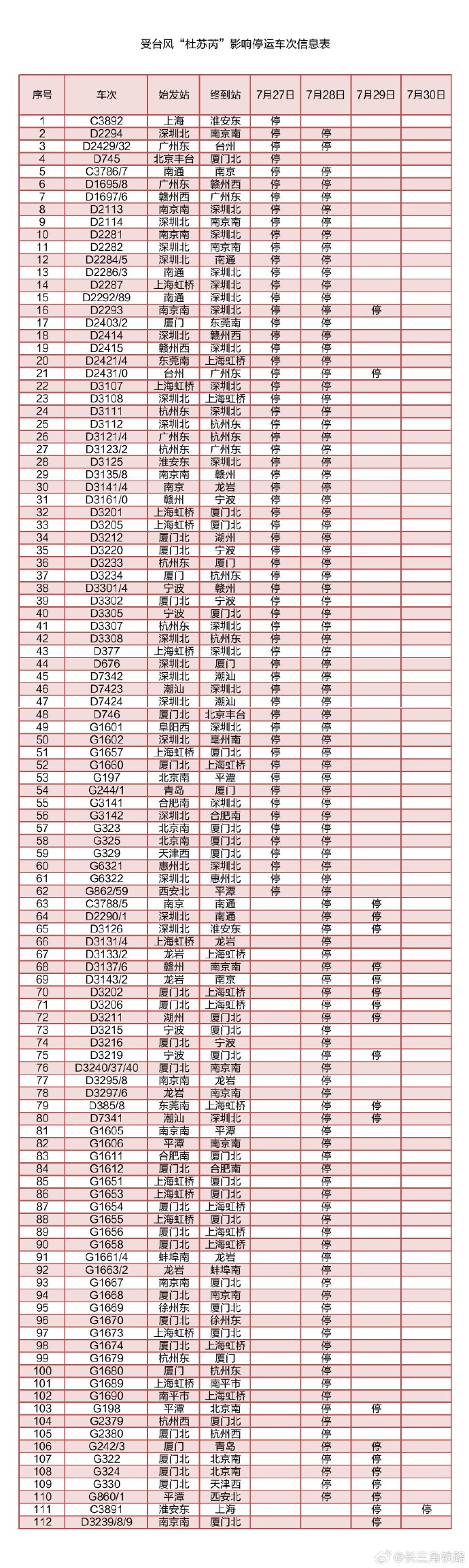 受颱風“杜蘇芮”影響,27日起長三角鐵路部分列車停運分享到:
