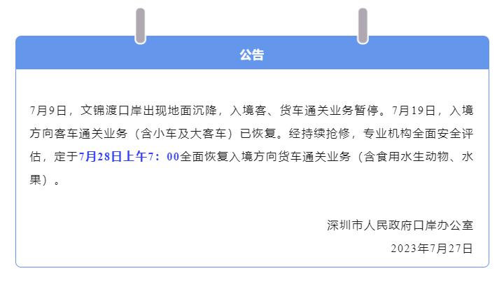 香港新聞網7月27日電 深圳市人民政府口岸辦公室27日發佈公告稱,7月9日,文錦渡口岸出現地面沈降,入境客、貨車通關業務暫停。7月19日,入境方向客車通關業務(含小車及大客車)已恢復。經持續搶修,專業機構全面安全評估,定於7月28日上午7:00全面恢復入境方向貨車通關業務(含食用水生動物、水果)。