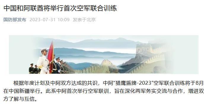 香港新聞網7月31日電 據“國防部發佈”微信公眾號31日消息,根據年度計劃及中阿雙方達成的共識,中阿“獵鷹盾牌-2023”空軍聯合訓練將於8月在中國新疆舉行。此系中阿首次舉行空軍聯訓,旨在深化兩軍務實交流與合作,增進雙方了解與互信。
