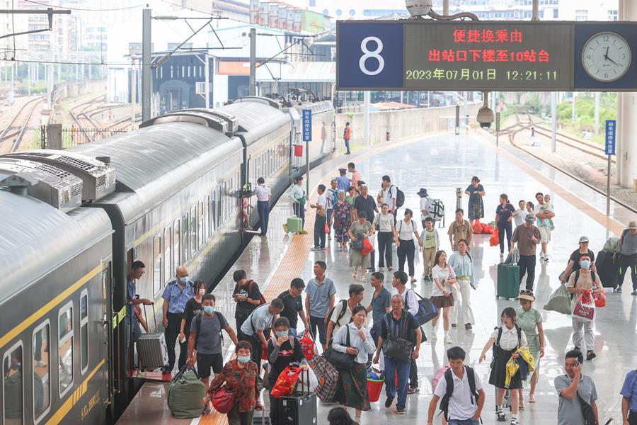 7月1日,江西南昌站,旅客抵站下車。香港中通社圖片 國鐵集團運輸部負責人介紹,客運方面,全國鐵路於7月1日同步實施新的列車運行圖,路網整體效能進一步提升。暑運以來,全國鐵路日均開行旅客列車10169列,較2019年同期增長14.2%。 上述負責人繼續說,新成昆鐵路、京唐城際鐵路、興泉鐵路、渝廈高鐵長沙至益陽段、銀蘭高鐵等新線迎來暑運“首秀”,客流持續走高。廣深港高鐵有序增開跨境列車,發送跨境旅客219萬人次;中老鐵路國際旅客列車發送跨境旅客3萬人次。 貨運方面,上述負責人指出,鐵路部門加強重點物資運輸,保障各地迎峰度夏。針對多地持續高溫天氣,鐵路部門加大能源保供運輸力度,用好西煤東運、北煤南運、疆煤外運等主要通道和繁忙幹線,增開貨物列車,提升電煤運輸能力。國家鐵路發送電煤1.25億噸,全國371家鐵路直供電廠存煤可耗天數始終保持在25天以上高位。夏糧運輸組織方面,國家鐵路累計發送糧食967萬噸,同比增長16.9%。 【編輯:丘志彬】