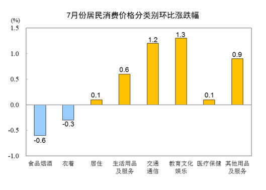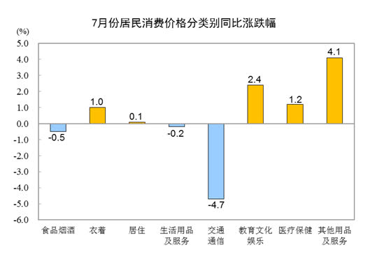 一、各類商品及服務價格同比變動情況 7月份,食品煙酒類價格同比下降0.5%,影響CPI(居民消費價格指數)下降約0.14個百分點。食品中,畜肉類價格下降14.0%,影響CPI下降約0.48個百分點,其中豬肉價格下降26.0%,影響CPI下降約0.41個百分點;鮮菜價格下降1.5%,影響CPI下降約0.03個百分點;鮮果價格上漲5.0%,影響CPI上漲約0.10個百分點;水產品價格上漲0.4%,影響CPI上漲約0.01個百分點;糧食價格上漲0.3%,影響CPI上漲約0.01個百分點。 其他七大類價格同比五漲兩降。其中,其他用品及服務、教育文化娛樂、醫療保健價格分別上漲4.1%、2.4%和1.2%,衣着、居住價格分別上漲1.0%和0.1%;交通通信、生活用品及服務價格分別下降4.7%和0.2%。