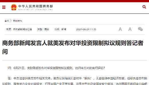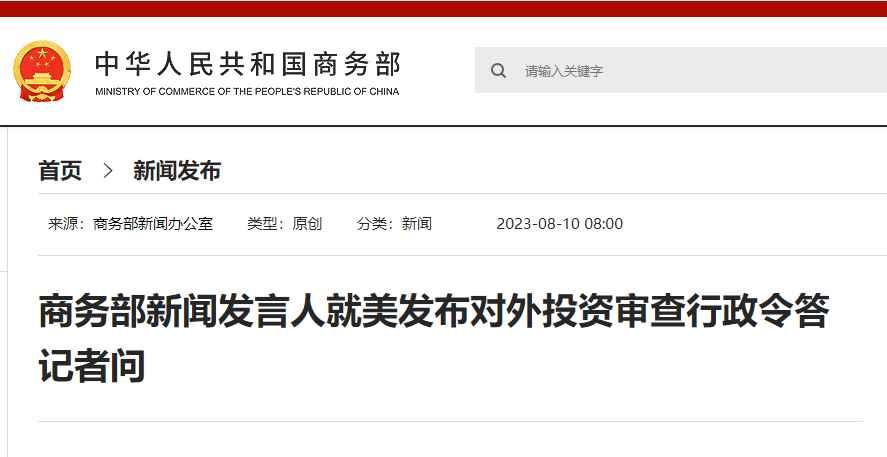 美發佈對外投資審查行政令,中國商務部回應分享到: