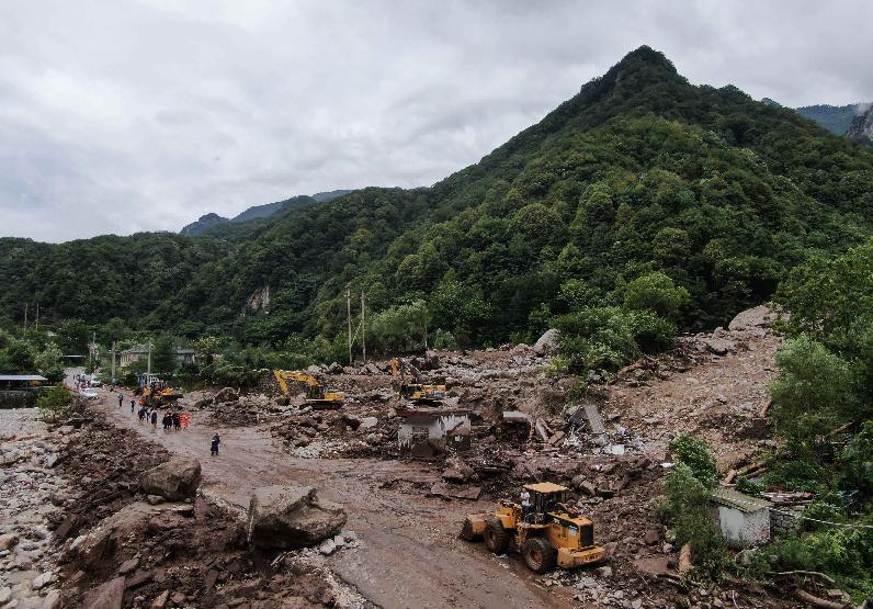 這是8月12日拍攝的西安市長安區灤鎮街道喂子坪村雞窩子組山洪泥石流災害現場。(新華社) 西安市組織980多名消防、公安及救援人員,出動1100多部挖掘機等設備全力搜救,爭取在黃金救援期,救出失蹤人員。 受局部強降雨影響,長安區灤鎮街道餵子坪村雞窩子組(位於秦嶺分水嶺210國道附近)11日下午5時許,突發山洪泥石流,2間民房被沖毀,210國道多處損毀,亦有電力設施毀壞,導致900戶居民一度停電,180多名村民要轉移安置。有農家樂負責人說,當時正是遊客進餐的時候,有遊客被山洪沖走失蹤。 截至13日,當地已累計轉移安置群眾186人,210國道段3處嚴重受損道路已搶通,21處輕微受損路段正在加固,受災區域49個通信基站已恢復服務,855戶居民已恢復供電。(完) 【編輯:丘志彬】