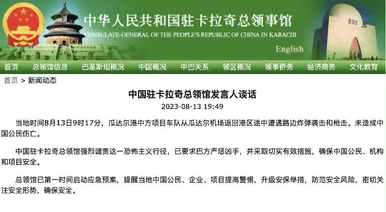 中國駐卡拉奇總領館強烈譴責這一恐怖主義行徑,已要求巴方嚴懲凶手,並採取切實有效措施,確保中國公民、機構和項目安全。 總領館已第一時間啟動應急預案,提醒當地中國公民、企業、項目提高警惕,升級安保舉措,防範安全風險,密切關注安全形勢,確保安全。 另據巴基斯坦三軍公共關係部消息,當地時間13日,恐怖分子在巴基斯坦瓜達爾地區向一車隊發動襲擊。巴基斯坦安全部隊開展反恐行動,擊斃2名恐怖分子,沒有軍方人士或平民受傷。(完) 【編輯:丘志彬】
