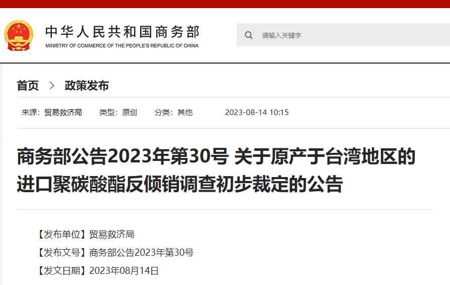 商務部:對原產於台灣地區的進口聚碳酸酯征收保證金