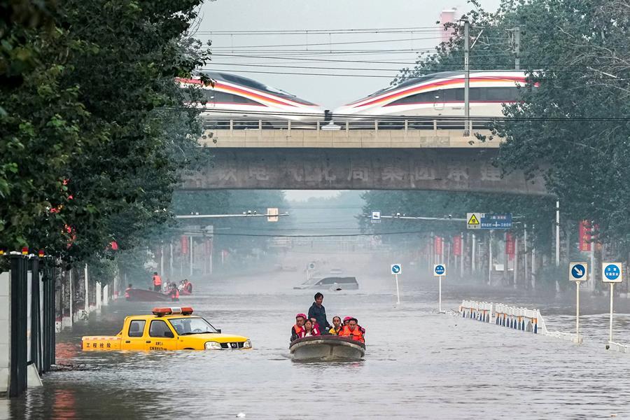 資料圖為8月2日,涿州市民眾乘坐船隻轉移。  香港中通社圖片