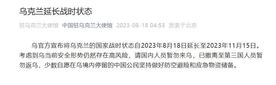 根據公告,烏官方宣布將烏克蘭的國家戰時狀態自2023年8月18日延長至2023年11月15日。