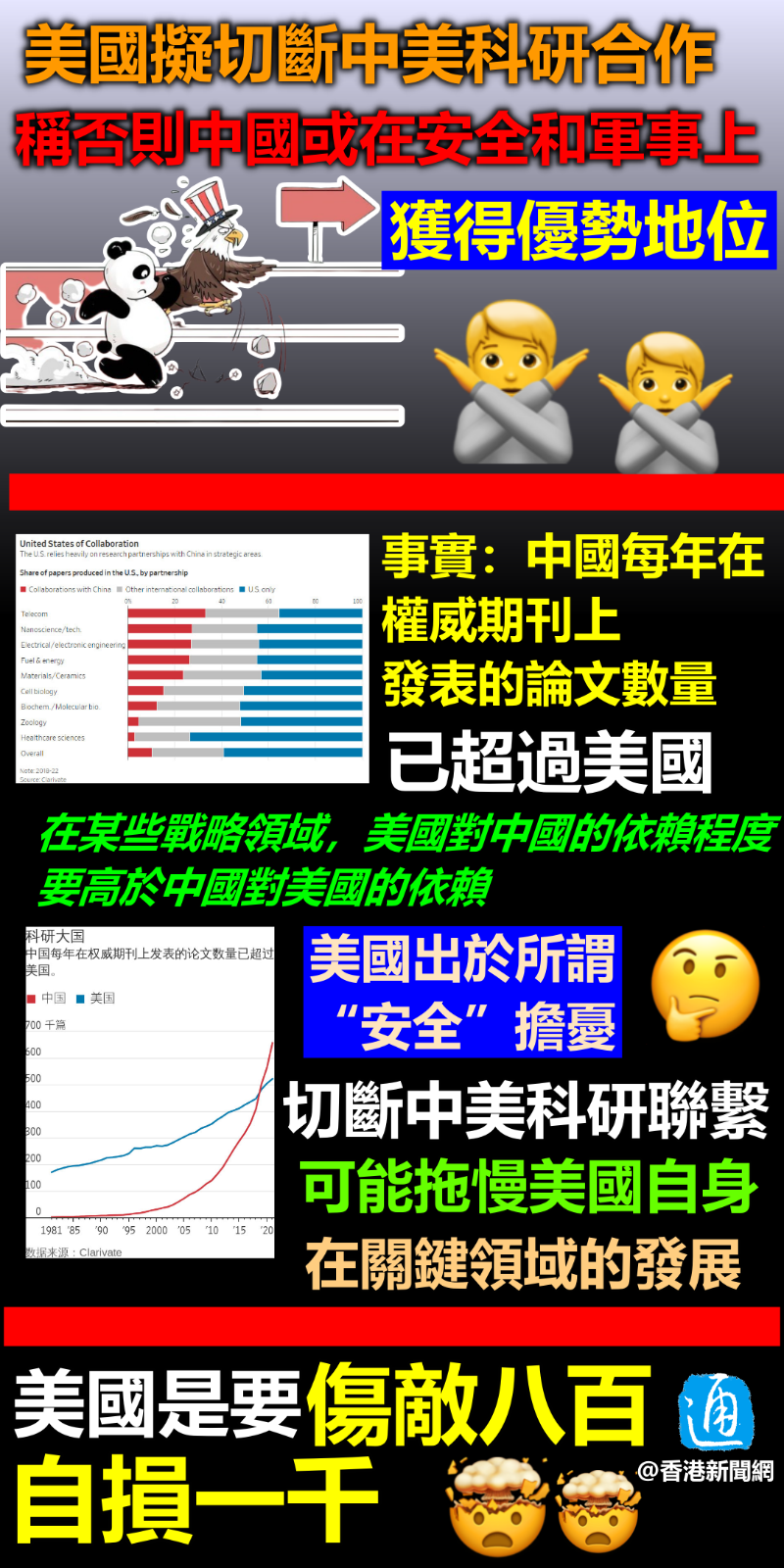 汪彥希製圖 這些政客炒作“威脅論”,聲稱中國會因此在關鍵技術上取得優勢,有助於中國實現軍事現代化,宣稱“美國必須停止助攻自己的毀滅”。 事實是, 根據追蹤全球科學研究的資料公司科睿唯安(Clarivate)的報告,在某些戰略領域,美國對中國的依賴程度要高於中國對美國的依賴;近年來中國每年在權威期刊上發表的論文數量已超過美國。 美國出於所謂“安全”擔憂切斷中美科研聯繫,反可能拖慢美國在生物科技、電信等關鍵領域的發展。美國要好好思量,不要搬起石頭砸了自己的腳。 【編輯:汪彥希】