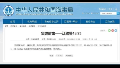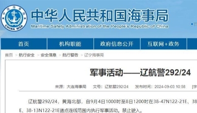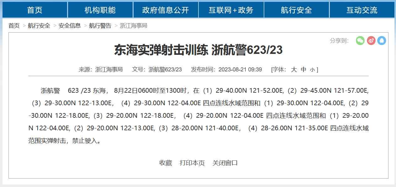 香港新聞網8月21日電 21日,浙江海事局發佈航行警告: 浙航警 623 /23 東海,8月22日0600時至1300時,在(1)29-40.00N 121-52.00E,(2)29-45.00N 121-57.00E,(3)29-30.00N 122-13.00E,(4)29-30.00N 122-04.00E 四點連線水域範圍和(1)29-30.00N 122-04.00E,(2)29-30.00N 122-18.00E,(3)29-20.00N 122-18.00E,(4)29-20.00N 122-04.00E 四點連線水域範圍和(1)29-20.00N 122-04.00E,(2)29-20.00N 122-13.00E,(3)28-20.00N 121-40.00E,(4)28-26.00N 121-35.00E 四點連線水域範圍實彈射擊,禁止駛入。
