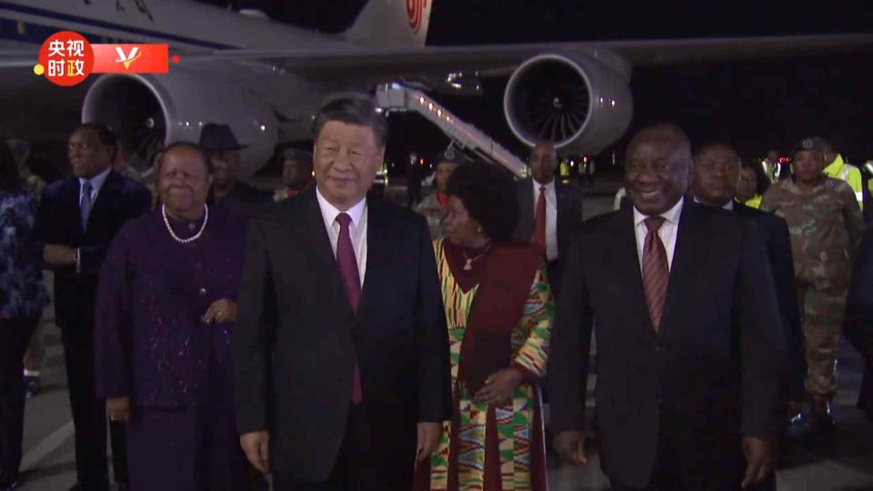 晚11時許,習近平乘坐的專機抵達約翰內斯堡坦博國際機場。南非總統拉馬福薩率外長潘多爾,陪同部長、總統府婦女、青年部長祖馬等政府高級官員在舷梯旁熱情迎接。南非婦女向習近平獻上鮮花,禮兵持槍致敬。身着民族服裝的民眾跳起奔放的舞蹈。 拉馬福薩熱烈歡迎習近平主席對南非進行國事訪問。習近平表示,我很高興再次到訪南非,期待同你就深化中南關係及共同關心的問題深入交換意見。 習近平發表機場書面講話,代表中國政府和中國人民,向南非政府和南非人民致以誠摯問候和良好祝願。習近平強調,今年是中南建交25周年,中南全面戰略夥伴關係步入嶄新階段。中南關係的鞏固和發展,不僅造福兩國人民,也為變亂交織的世界注入更多穩定性。我相信,在雙方共同努力下,我這次訪問一定能夠取得圓滿成功。 習近平指出,作為新興市場國家和發展中大國的重要合作平台,金磚合作機制已經成為促進世界經濟增長、完善全球治理、推動國際關係民主化的建設性力量。相信這次金磚國家領導人會晤將成為金磚合作機制發展歷程中的重要里程碑,把發展中國家團結合作提升到更高水平。我還將出席中非領導人對話會,同非洲國家領導人一道,共商合作大計,共謀發展之道,共促世界和平。 時值午夜時分,習近平乘坐的車隊從機場前往下榻飯店途中,華僑華人自發等候在沿途街道,揮舞中南兩國國旗,高舉“中南友誼萬歲”等橫幅,熱烈歡迎習近平到訪。 蔡奇、王毅等陪同人員同機抵達。 中國駐南非大使陳曉東也到機場迎接。 【編輯:丘志彬】