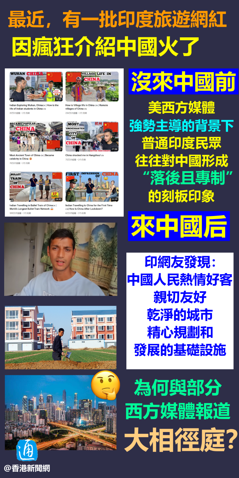汪彥希製圖 近年來,美西方媒體不斷抹黑中國,但不少印度網紅到中國旅游,從游客視角切入,展現的真實中國卻吸引觀眾瘋狂觀看。莫非,部分美西方媒體鏡頭下的中國與印度旅游博主下的中國差別“很大”? 事實上,在美西方媒體強勢主導的背景下,普通印度民眾或很難通過媒體全面瞭解真實的中國,因此往往對中國形成“落後且專制”的刻板印象,幾乎沒有機會接觸中國可愛可敬的一面。 印度旅游網友的視頻無疑提供了另一客觀視角,因而引發印度網友追看狂潮! 【編輯:汪彥希】