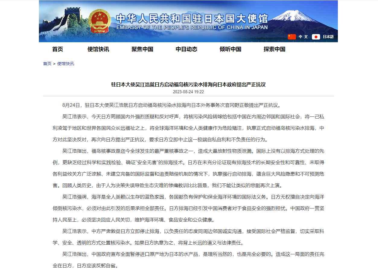 香港中通社8月24日電 8月24日,中國駐日本大使吳江浩就日方啟動福島核污染水排海向日本外務事務次官岡野正敬提出嚴正抗議。