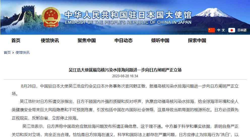 中國駐日本大使館官網截圖 中國駐日本大使館官網28日消息,吳江浩強調日方不顧國內外強烈質疑和反對呼聲,執意啟動福島核污染水排海,給全球海洋環境和全人類健康安全帶來巨大風險隱患和不可預測危害,引發包括中國在內國際社會強烈憤慨。日方排海在道義、科學和法律上都存在嚴重問題,應立即停止這一錯誤行為,以真正負責任的態度同周邊鄰國誠實溝通,接受國際社會嚴格監督,切實採取科學、安全、透明的方式處置核污染水。 吳江浩指出,在中方既有關切基礎上,結合近日事態發展,日方應認真回答幾個問題:為什麼日方刻意強調氚元素經過了稀釋處理,但始終對其它放射性核素閃爍其辭?為什麼日方不進行全面系統的海洋環境監測?為什麼日方拒絕其他利益攸關方共同參與建立國際監測機制? 吳江浩並就中國駐日本使領館遭受滋擾提出嚴正交涉,表示近日中國駐日使領館接到大量來自日國內的騷擾電話,對使領館正常運轉造成嚴重干擾。中方敦促日方依法處置,切實保障中國使領館館舍、人員及在日機構、企業、公民和來日中國遊客人身安全。(完) 【編輯:丘志彬】