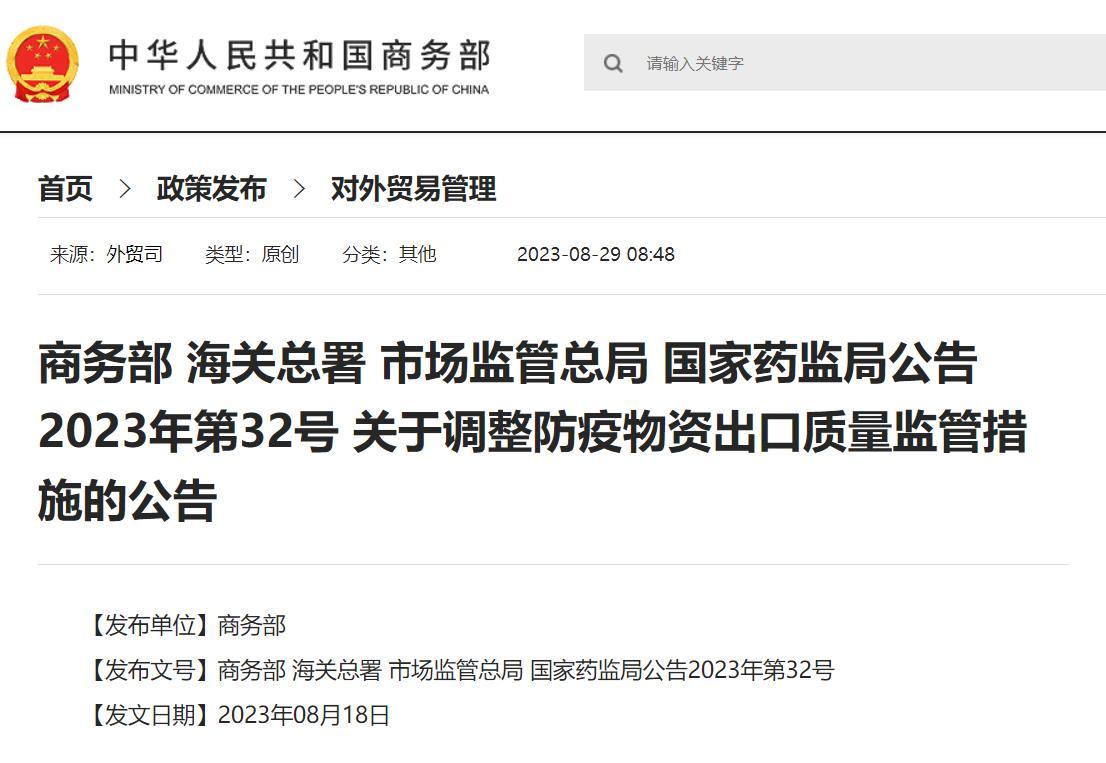 香港新聞網8月29日電 據中國商務部網站消息,近日,商務部、海關總署、市場監管總局、國家藥監局等四部門聯合發佈公告,調整防疫物資出口質量監管措施。 公告稱,當前,新冠疫情全球衛生緊急狀態結束,中國疫情防控進入常態化管理階段。為適應新形勢要求,現就非醫用口罩、新型冠狀病毒檢測試劑、醫用口罩、醫用防護服、呼吸機、紅外體溫計等六大類防疫物資產品出口質量監管措施作出如下調整: 自公告發佈之日起,商務部停止確認取得國外標準認證或註冊的防疫物資生產企業清單工作,市場監管總局停止提供國內市場查處的非醫用口罩質量不合格產品和企業清單工作。海關不再以上述清單作為相關產品出口驗放的依據。相關出口企業無需再申請進入“取得國外標準認證或註冊的醫療物資生產企業清單”或“取得國外標準認證或註冊的非醫用口罩生產企業清單”,報關時無需再提供“出口方和進口方共同聲明”或“出口醫療物資聲明”。 自公告發佈之日起,商務部、海關總署、國家藥監局2020年第5號公告(《關於有序開展防疫物資出口的公告》)及商務部、海關總署、市場監管總局2020年第12號公告(《關於進一步加強防疫物資出口質量監管的公告》)同時廢止。有關防疫物資出口企業要確保產品質量安全、符合相關標準要求,自覺維護中國產品國際聲譽。