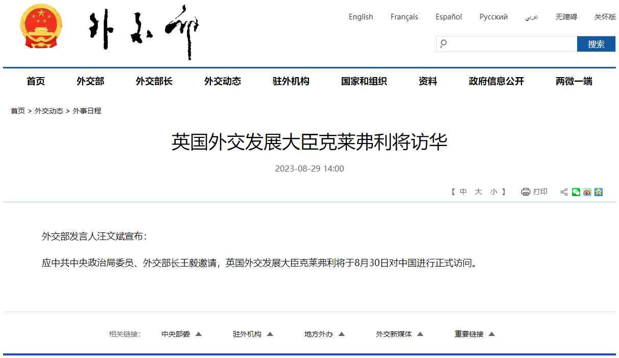 應中共中央政治局委員、外交部長王毅邀請,英國外交發展大臣克萊弗利將於8月30日對中國進行正式訪問。
