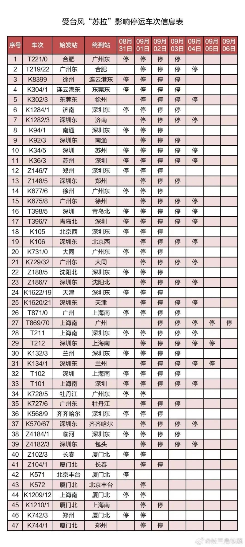 部分列車停運 據中國鐵路上海局集團公司消息,受第9號颱風“蘇拉”影響,為確保列車運行安全,鐵路部門計劃對杭深線、京港高鐵、廣深城際、廣深港高鐵、穗深城際、京九線等線路運行的部分列車采取停運措施。截至30日17時30分,計劃停運8月31日至9月6日間共121趟旅客列車:其中停運動車組列車74趟,停運普速列車47趟。
