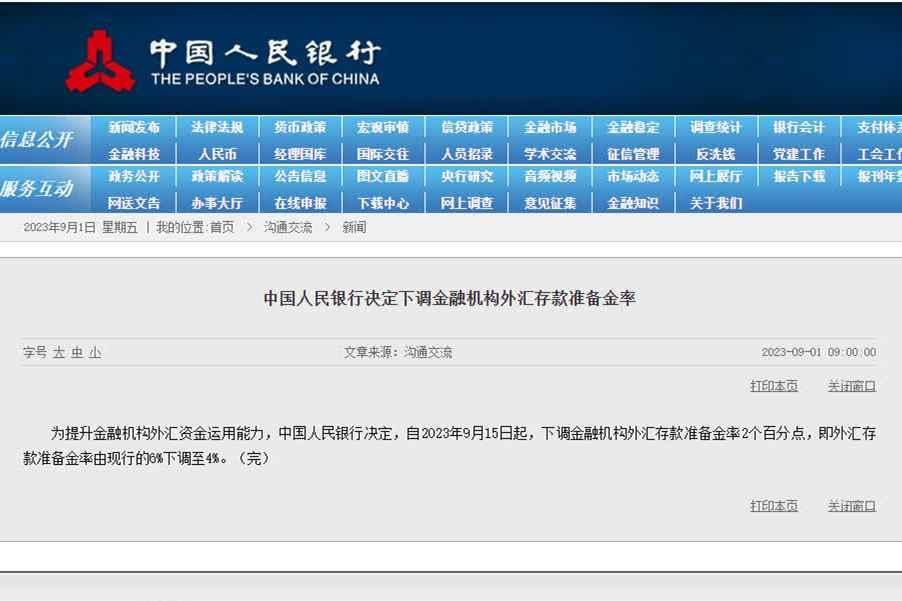香港新聞網9月1日電 據中國人民銀行網站9月1日消息,為提升金融機構外匯資金運用能力,中國人民銀行決定,自2023年9月15日起,下調金融機構外匯存款準備金率2個百分點,即外匯存款準備金率由現行的6%下調至4%。