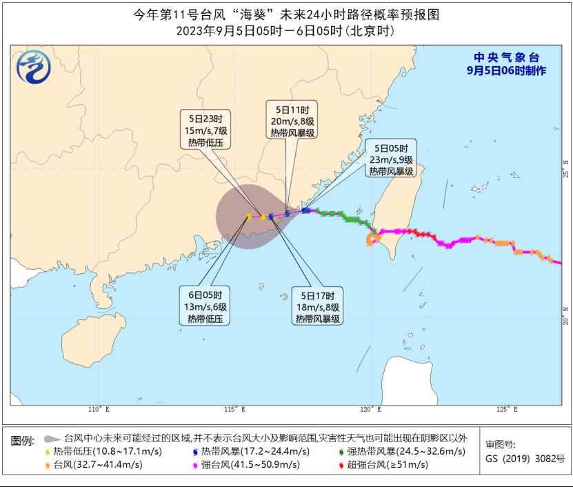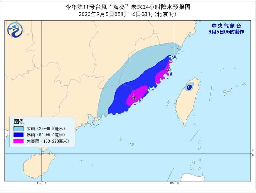 大風預報:9月5日08時至6日08時,台灣海峽、東海西南部、南海東北部以及福建沿海、廣東中東部沿海將有6-8級、陣風9-10級大風。