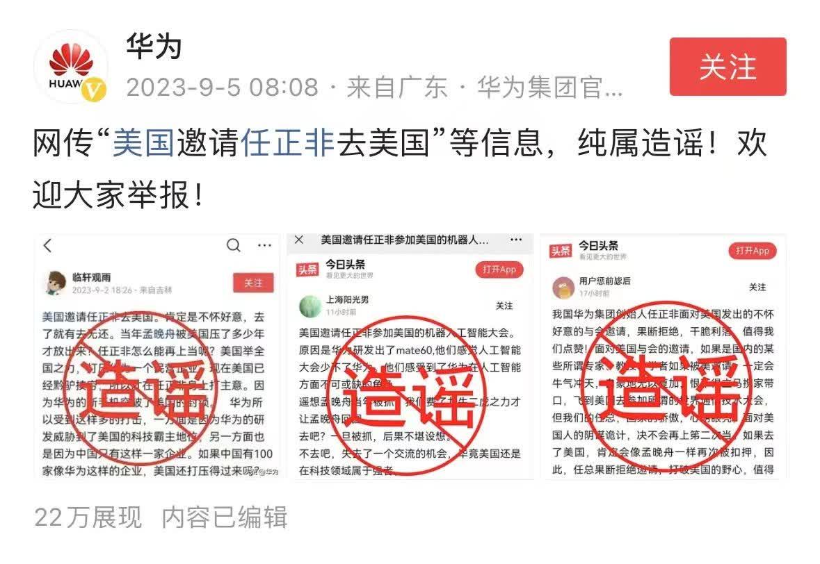 9月5日,華為通過今日頭條平台進行回應稱:網傳“美國邀請任正非去美國”等信息,純屬造謠!歡迎大家舉報!