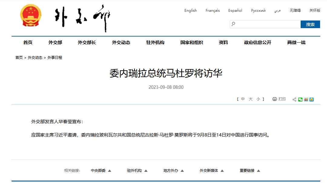 香港中通社9月8日電 中國外交部發言人華春瑩9月8日宣布:應國家主席習近平邀請,委內瑞拉玻利瓦爾共和國總統尼古拉斯·馬杜羅·莫羅斯將於9月8日至14日對中國進行國事訪問。