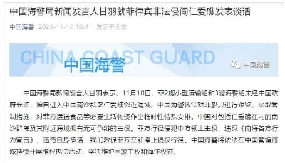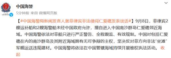 香港新聞網9月8日電 據@中國海警 消息,9月8日,菲律賓2艘運補船和2艘海警船未經中國政府允許,擅自進入中國南沙群島仁愛礁鄰近海域。中國海警依法對菲船只進行嚴正警告、全程跟監、有效規制。中國對包括仁愛礁在內的南沙群島及其附近海域擁有無可爭辯的主權,堅決反對菲方向非法“坐灘”軍艦運送違規建材。中國海警將依法在中國管轄海域持續開展維權執法活動。