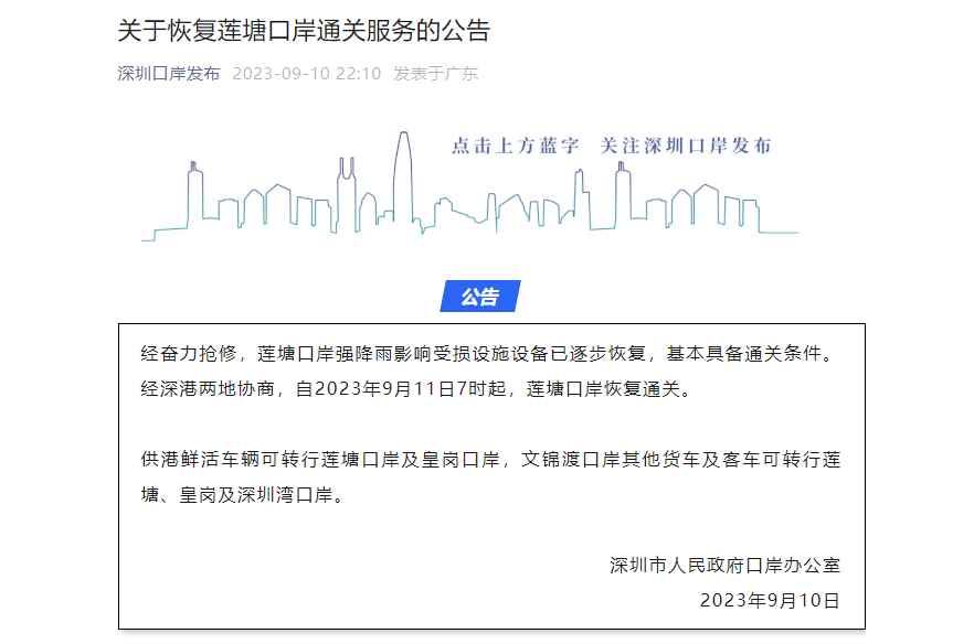 香港新聞網9月11日電 10日晚間,據深圳市口岸辦消息,經奮力搶修,蓮塘口岸強降雨影響受損設施設備已逐步恢復,基本具備通關條件。經深港兩地協商,自2023年9月11日7時起,蓮塘口岸恢復通關。