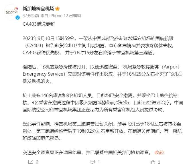 不久後,@新加坡樟宜機場 發佈CA403情況更新: 2023年9月10日15時59分,一架從中國成都飛往新加坡樟宜機場的國航航班(CA403)報告前貨倉和衛生間出現煙霧,宣佈緊急情況並要求降落優先權。CA403獲得優先權, 並於16時15分左右降落於樟宜機場第三跑道。 著陸後,飛機的緊急滑梯被打開,以便迅速撤離。 機場緊急救援服務(Airport Emergency Service)立即對該事件作出反應,並於16時25分左右撲滅了飛機左側發動機的火。 機上共有146名旅客和9名機組人員,目前均已安全撤離,並乘坐巴士前往航站樓。9名乘客在撤離過程中因吸入煙霧或擦傷而受輕傷,目前已經得到治療。中國國際航空公司和樟宜機場集團正在盡力為所有乘客和機組人員提供協助。 受此事件影響,樟宜機場第三跑道曾短暫關閉。涉事飛機已於18時左右被轉移至別處。第三跑道經檢查後於19時02分左右重新開放。在跑道關閉期間,有一架航班改降印尼巴淡島。