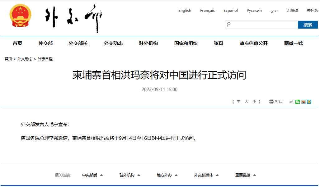 香港新聞網9月11日電 據中國外交部網站11日消息,外交部發言人毛寧宣佈:應國務院總理李強邀請,柬埔寨首相洪瑪奈將於9月14日至16日對中國進行正式訪問。