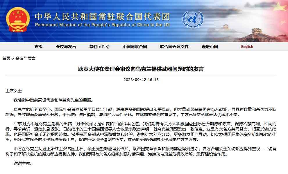 網站截圖 當天,聯合國負責裁軍事務的副秘書長中滿泉作通報表示,過去幾個月,向烏克蘭提供武器的行動在擴大,同時,也有報告顯示有國家向俄羅斯轉讓武器。毋庸置疑,向任何衝突局勢提供武器和彈藥都會引發嚴重關切,因為這可能使局勢升級,並帶來武器流散風險。她強調所有各方必須遵守國際義務,防止常規武器非法轉讓,並立刻停止使用集束彈藥。 耿爽發言說,烏克蘭危機延宕至今,國際社會普遍希望早日停火止戰,越來越多的國家提出和平倡議,但大量武器裝備仍在流入戰場,且品種數量和殺傷力不斷增強,導致地面戰事蔓延升級,平民傷亡與日俱增,局勢陷入惡性循環。在此前安理會的審議中,中方已多次就此表達憂慮和不安。 耿爽表示,中方期待有關方面積極回應國際社會期待和呼聲,保持冷靜克制,相向而行,尋求共識,避免加劇緊張。日前結束的二十國集團領導人會議發表聯合聲明,就烏克蘭問題發出一致信息。這是有關各方共同努力、相互妥協的結果,也是國際社會樂見的積極跡象。希望安理會能從中汲取智慧和經驗,避免擴大對立分歧,更多激發正向互動,切實發揮國際集體安全機制核心的作用,用好憲章賦予的和平解決爭端工具,促進各類和平倡議的落實,推動形勢逐步朝著和平穩定的方向發展。 耿爽說,中方在烏克蘭問題上始終主張各國主權、領土完整都應得到維護,聯合國憲章宗旨和原則都應得到遵守,各方合理安全關切都應得到重視,一切有利於和平解決危機的努力都應得到支持。我們願同有關各方繼續加強對話溝通,為推動烏克蘭危機政治解決發揮建設性作用。 【編輯:丘志彬】