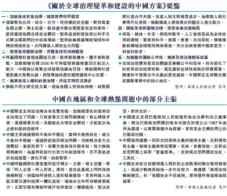 中國外交部發布《關於全球治理變革和建設的中國方案》香港新聞網9月14日電 中國外交部13日發布《關於全球治理變革和建設的中國方案》(下文簡稱方案)。方案中,中國呼籲國際社會踐行真正的多邊主義,維護以聯合國為核心的國際體系。方案強調,國際社會要堅持以開放為導向,堅持多邊主義,堅定維護自由貿易和多邊貿易體制,反對單邊主義和保護主義,促進互聯互通,鼓勵融合發展。方案稱,下月中國將舉辦第三屆“一帶一路”國際合作高峰論壇,願以此為契機推進共建“一帶一路”同2030年可持續發展議程有效對接、協同增效。