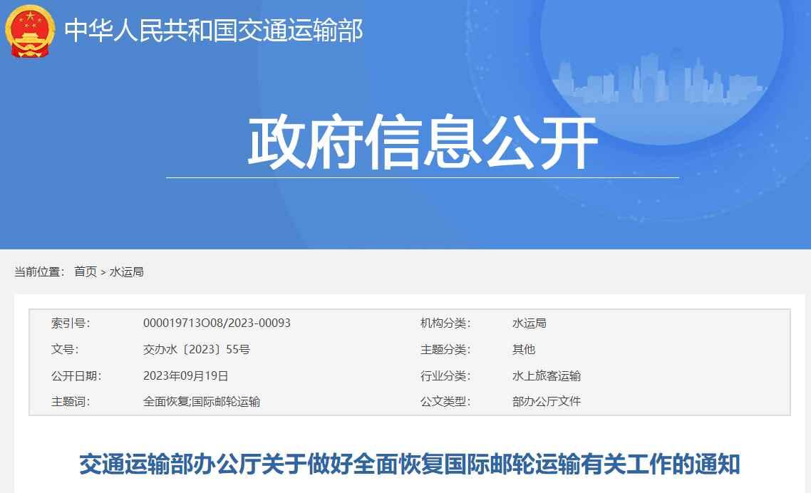 香港新聞網9月20日電 9月19日,中國交通運輸部辦公廳發佈關於做好全面恢復國際郵輪運輸有關工作的通知,在上海、深圳郵輪港口試點恢復國際郵輪運輸的基礎上,經商有關部門,決定自本通知發佈之日起,全面恢復進出中國境內郵輪港口的國際郵輪運輸。
